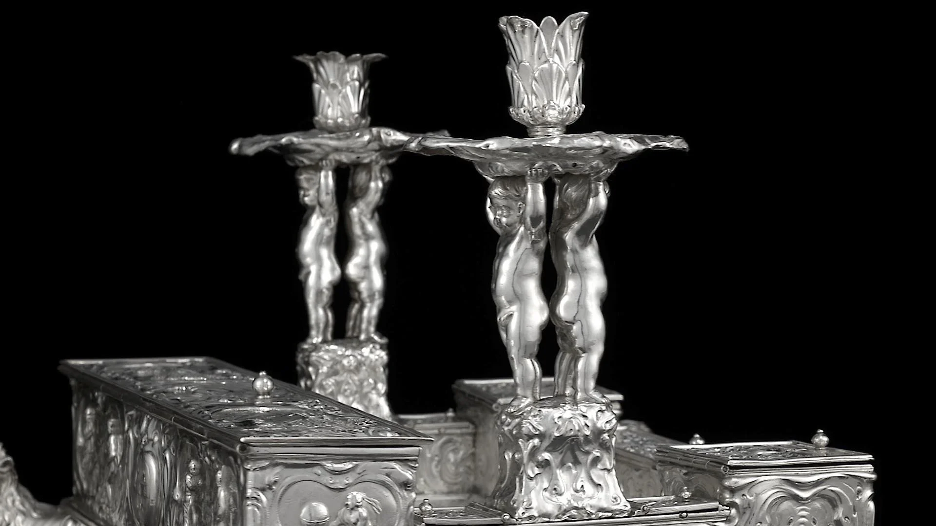 This extraordinary inkstand is not only a magnificent example of an exceeding rare 17th century form, but also a virtuoso display of the finest chasing of the time. Monumental in size, it is over twice the weight of the largest standishes recorded in the surviving records of the Royal Jewel House for the period. Struck with the mark of the London assay master and goldsmith Alexander Jackson (d.1670), the chasing is of a standard and inventiveness not seen in the work of London goldsmiths at the time. The quality of the chasing, in the auricular style, the originality of the allegorical scenes and the sophistication of its conception, all point to the Utrecht born silversmith Christiaen van Vianen and his workshop as the authors of the piece. The arms engraved on the inkstand record the ownership of the piece from the early 18th century, however the original patron remains unknown. The complex and intellectual iconography of the inkstand or standish and its creation by a foreign goldsmith who was employed by the King, points to either a royal patron or a high standing member of the Court, such as the Earl of Northumberland, for whom van Vianen is known to have worked.